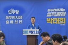 더불어민주당 박태희 동두천시장 예비후보가 7일 시청 기자실에서 기자회견을 열고 6·3 지방선거 출마를 공식선언했다. 박태희 예비후보는 “동두천의 미래를 가로막고 있는 동네정치의 한계를 넘어 도시의 미래비전을 제시하고 실천할 수 있는 실력정치로 동두천의 미래를 바꾸겠다”며 출사표를 던졌다. 이어 “이번 지방선거는 동두천의 향후 100년을 바꿀 중요한 선거”라며 “과거 관성에 갇혀 이대로 쇠퇴할 것인지 아니면 유능한 실력정치로 동두천이 경기북부의 핵심 도시로 재도약할 것인가를 결정하는 중차대한 시기에 저 박태희가 동두천의 미래를 바꿀 적임자”라며 지지를 호소했다. 박 예비후보는 기회의 도시 동두천, 지속의 도시 동두천, 시민의 도시 동두천, 돌봄의 도시 동두천 등 4대 비전을 제시했다. 마지막으로 “정성호 국회의원 선임비서관 출신으로 20년간의 도의원 및 중앙정치 경험에서 쌓은 실력을 동두천을 위해 다 바칠 수 있는 기회를 달라“고 말했다. [ 경기신문 = 유정훈 기자 ]