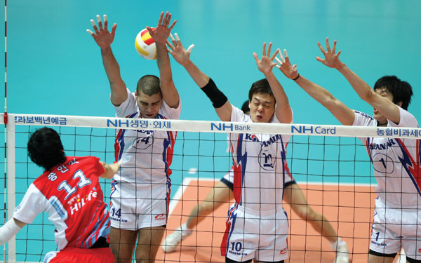 그러나 위기에서 대한항공은 장광균의 오픈공격으로 한숨을 돌린 뒤 25-25 동점 상황에서 보비와 신영수의 오픈이 잇따라 폭발하면서 힘겹게 첫 세트를 낚았다.