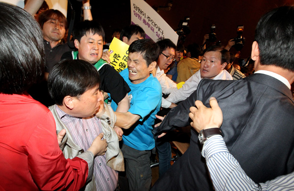 당권파 당원 100여명은 이날 오후 9시50분께 “해산하라, 불법 중앙위원회”를 외치며 단상으로 달려나갔으며 이 과정에서 격렬한 물리적 충돌이 빚어졌다.