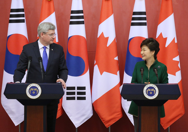 박 대통령은 이날 정상회담 모두발언에서 “한-캐나다 FTA는 양국 관계 협력에 새로운 룰이라고 할 수 있다”며 “이것을 바탕으로 두 나라의 경제 협력이 더 심화되는 기대가 크다”고 밝혔다.