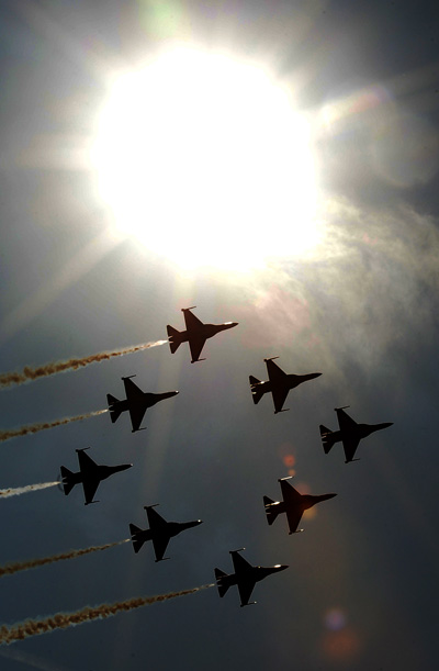 한 치의 오차도 없는 공중회전에서부터 중력을 무시하는 속사포 같은 역동적인 에어쇼가 펼쳐지자 수만명이 모인 관람석에서 탄성과 함성이 연신 터져 나온다.