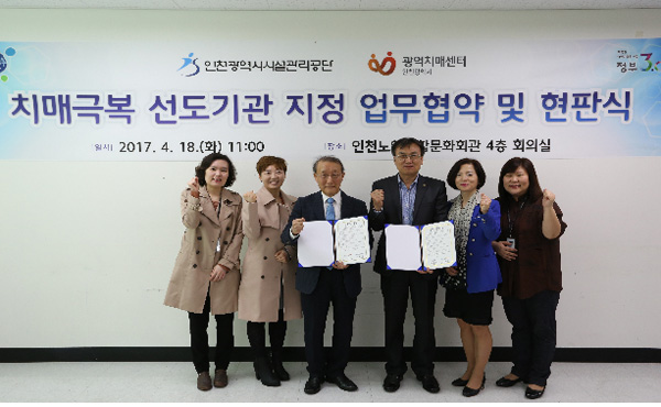 인천시 노인종합문화회관은 18일 인천지역 노인복지기관 중 최초로 치매극복 선도기관으로 지정돼 인천시 광역치매센터와 업무협약을 체결하고 현판식을 가졌다. 치매극복 선도기관 지정사업은 전국적인 캠페인으로 각 기관의 직원들이 치매 파트너 교육에 참여하고 기관의 특성을 활용해 치매 친화적인 환경을 조성하는 데 목적을 두고 있다./류정희기자 rjh@