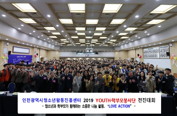 인천청소년활동진흥센터는 지난 6일 ‘2019 YOUTH&학부모봉사단 전진대회 LOVE ACTION’ 행사를 개최했다. YOUTH&학부모봉사단의 이번 전진대회에서는 각 학교별로 청소년, 학부모, 지도교사 대표에게 임명장을 수여하고, 2019년 사업 소개와 추진계획을 서로 공유하며 소통하는 기회를 가졌다. /박창우기자 pcw@