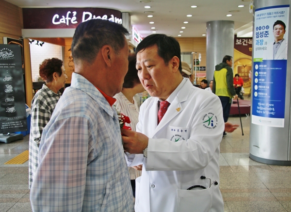 인천의료원은 지난 8일 어버이날을 맞아 400여 명의 어르신 환자에게 카네이션을 달아드리는 행사를 진행했다고 9일 밝혔다. 이날 의료원 로비에서는 조승연 원장이 직접 방문하는 어르신들에게, 또 담당 주치의는 직접 회진시간에 입원환자에게 카네이션을 달아드렸다. /박창우기자 pcw@
