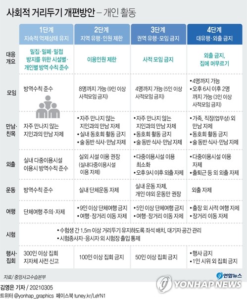 새로운 체계에서는 단계에 따라 지인, 친지 등과 만날 수 있는 사적모임의 규모도 달라진다.