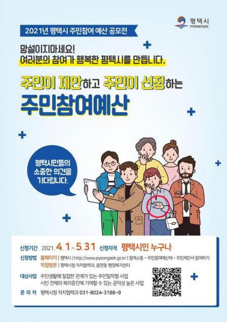 경기 평택시가 '2021년 주민참여예산 공모전' 홍보 포스터에 남성 혐오 손 모양으로 오해를 살 수 있는 그림을 삽입해 논란이 되고 있다.