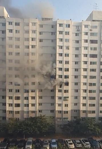 15층 높이 아파트 중 7층 세대에서 발생한 불은 에어컨 실외기가 있는 베란다 쪽에서 크게 번졌으며 검은 연기가 아파트 외벽을 따라 위층 세대로 빠르게 퍼졌다.