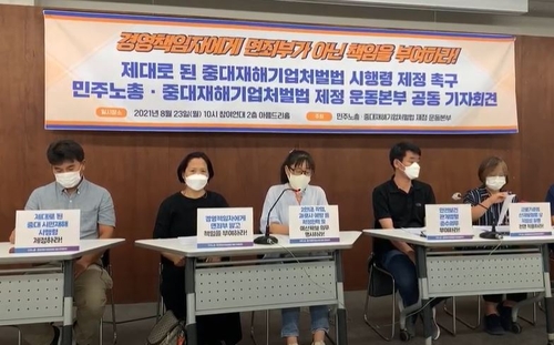 민주노총·중대재해기업처벌법 제정 운동본부는 이날 종로구 참여연대에서 기자회견을 열고 "제정된 중대재해법이 실효성을 갖기 위해선 안전보건 관리자와 하청업체 담당자 일부가 떠맡았던 책임을 기업 시스템의 최종 책임자인 최고 경영자에게 제대로 물을 수 있어야 한다"고 밝혔다.