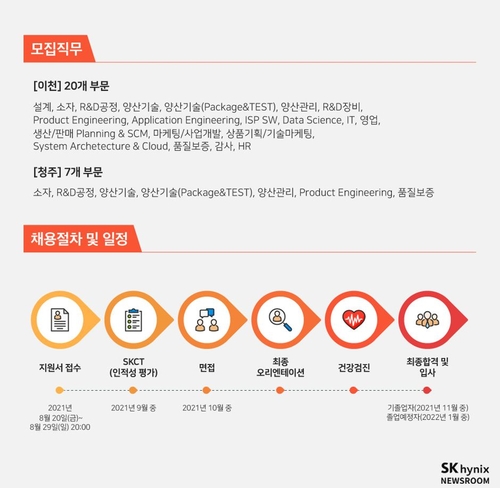 모집 직무는 설계, 소자, R&D공정, 양산기술, 양산관리 등 20개 분야이며, 이천·청주 사업장 지역을 구분해 직무별 채용이 이뤄진다.