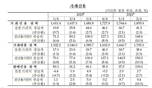 2분기 말 가계신용도 1분기말(1천764조6천억원)보다 41조2천억원(2.3%) 늘었다. 증가액이 직전 분기(1분기 36조7천억원)보다 4조5천억원 많고, 2분기 기준으로는 역대 기록이다.