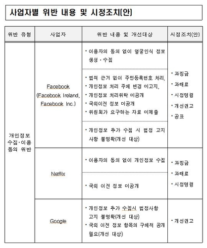 개인정보 보호 정책을 총괄하는 중앙행정기관인 개인정보보호위원회(개인정보위)는 25일 제14회 전체회의를 열어 개인정보보호 법규를 위반한 페이스북·넷플릭스·구글 등 3개 사업자에 과징금 66억6천만원과 과태료 2천900만원을 부과하고 시정명령·개선권고를 내리는 등 시정조치를 의결했다고 밝혔다.