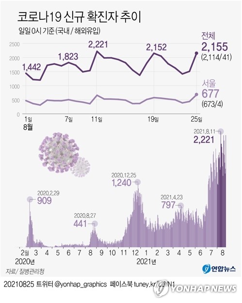 최근 1주간(8.19∼25) 발생한 신규 확진자만 보면 일별로 2천152명→2천50명→1천879명→1천626명→1천417명→1천509명→2천155명을 기록하며 하루 최소 1천400명 이상씩 나왔고, 많게는 2천명 안팎을 오갔다.