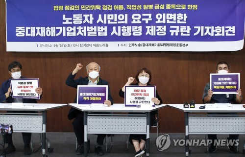 그러면서 "세부 가이드라인을 조속히 보급하고 계도 중심으로 현장을 지도하면서 최소 1년 이상의 준비 시간을 줘야 한다"며 "사업주에 과도한 불안감을 조장하는 것은 재해 예방을 어렵게 만들 수 있으므로 더욱 근본적으로는 과도한 처벌 등을 규정한 법을 개정해야 한다"고 요구했다.