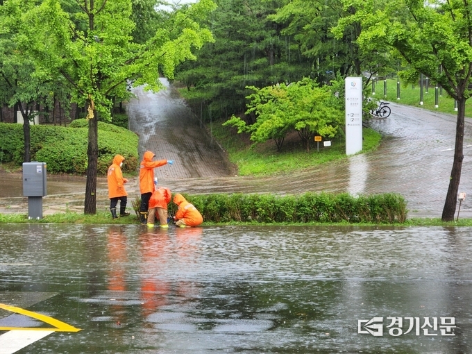 수원시 팔달구 수원월드컵경기장 앞 왕복 6차선 도로에는 배수구가 한 때 막혀 물이 차 올랐다. 광교신도시 웰빙타운 일대도 오전 한때 진입로 일부가 침수돼 이 지역을 지나는 차량 이용에 불편을 겪었다.