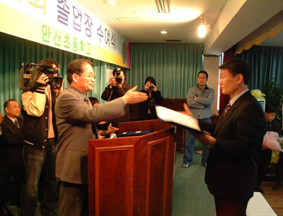▲43년만에 명예 졸업을 하는 겁니다. 졸업장이 중요한 것은 아니지만 남들이 다 갖고 있는 졸업장이 하나도 없어 항상 마음속에 짐으로 남아 있었는데 늦게나마 안산초등학교에서 명예졸업장을 수여해 한없는 감사와 기쁨을 느낀다.