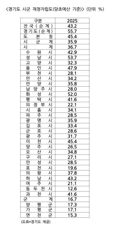 경기도의 경우, 2025년 재정자립도는 성남이 53.7%, 화성이 52.0%로 50%를 넘은 데 비해 동두천 12.6%, 양평 17.3%로 10%대로 나타나 큰 차이를 보이지만 국비지원율은 3%로 동일하게 된다.