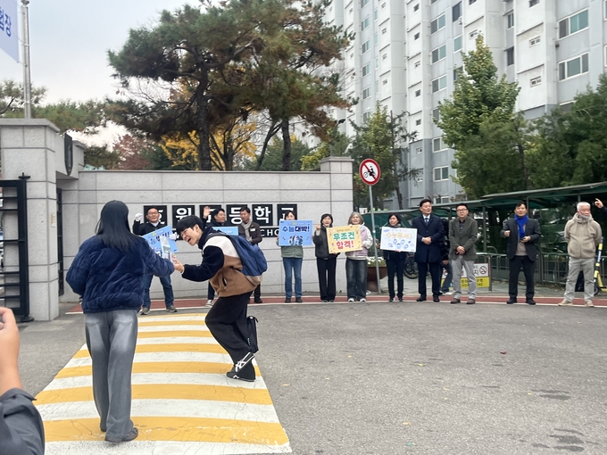입실 시간에 늦지 않으려는 수험생들은 빠른 걸음으로 정문을 향했다. 교문 앞에는 “수능 대박!”, “파이팅! 잘 할 수 있다!”는 응원 구호가 연달아 터져 나왔다. 경찰과 취재진, 응원 온 국회의원 보좌관까지 한목소리였다. 학생들이 지나가자 뜨거운 박수 소리도 이어졌다.