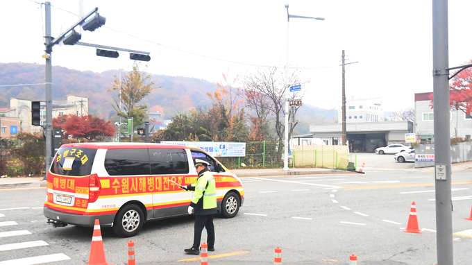곳곳에서는 긴급 상황도 이어졌다. 경찰차와 해병대 전우회 차량이 ‘지각 위기’에 놓인 학생들을 태우고 도착했고, 차에서 내린 학생들이 전력으로 교문을 향해 뛰었다. “빨리! 빨리!”라는 외침이 뒤따랐다.