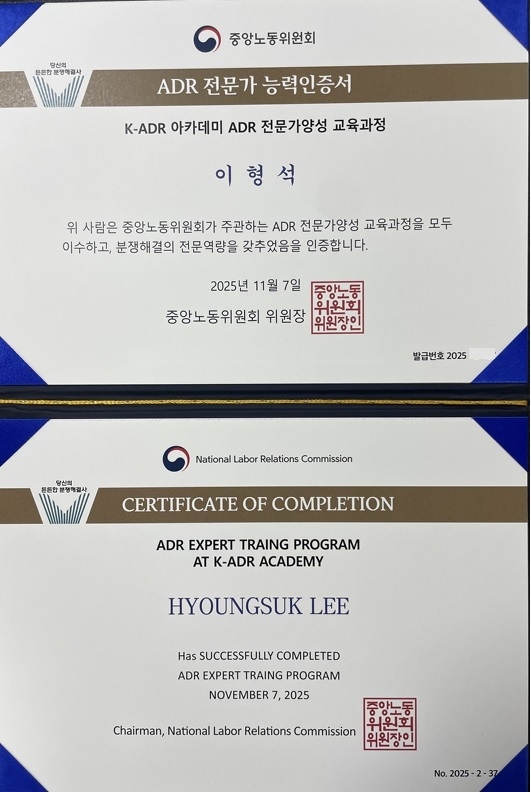 이 부장은 지난 7일 정부세종청사에서 열린 중앙노동위원회 ‘ADR 전문가 양성 고급과정 2기’ 수료식에서 인증서를 받았다.