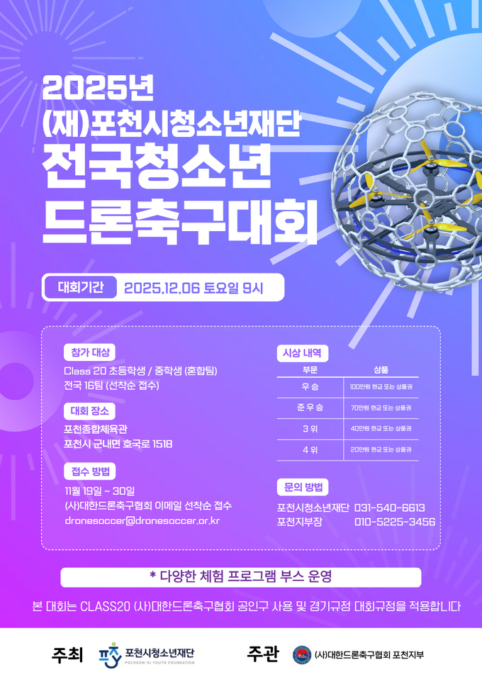 한편 드록축구대회와 관련된 문의는 포천시청소년교육문화센터로 하면 되고 참가 신청은 11월 30일까지 (사)대한드론축구협회 포천지부 이메일로 신청하면 된다.