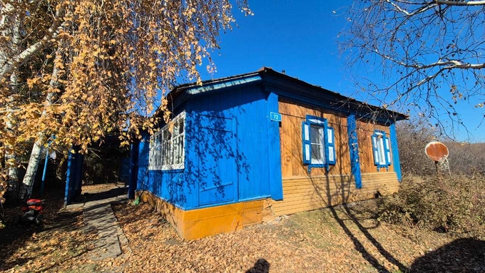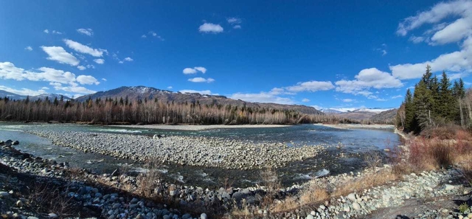 다음날, 벨루하 봉을 향해 점차 고도를 높여 나가던 중, 산꼭대기를 덮고 있는 흰 눈이 원경을 이루고 노랗게 단풍 든 자작나무 숲이 중경을 이루는 속에, 듬성듬성 자리 잡은 근경의 파란색 집들이 너무 아름다워 잠시 차를 세웠다.