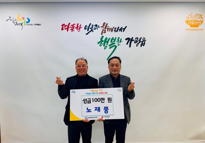 가평군 가평읍 지역사회보장협의체(지사협) 노재풍 위원장은 2일 행정복지센터를 방문해 '2025년 가평군사회복지대상' 수상을 통해 받은 시상금 중 100만원을 이웃돕기 성금으로 기탁했다.