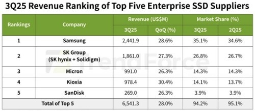 트렌드포스에 따르면 3분기 상위 5개 브랜드 총매출은 65억4천만달러로 전분기 대비 28% 급증했다. 북미 CSP의 AI 인프라와 서버 확장으로 eSSD 출하량·가격이 크게 올랐고, 4분기 평균 계약가도 25% 이상 상승할 전망이다.