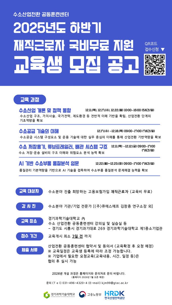 경기과학기술대학교가 수소산업에서 활약할 인재를 양성하기 위한 교육훈련생 모집에 나섰다.