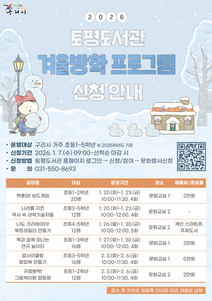 구리시는 겨울방학을 맞은 어린이들을 위해 지역 내 공공도서관 4곳에서 독서를 기반으로 한 창의적이고 체험 중심의 다양한 프로그램을 운영한다.