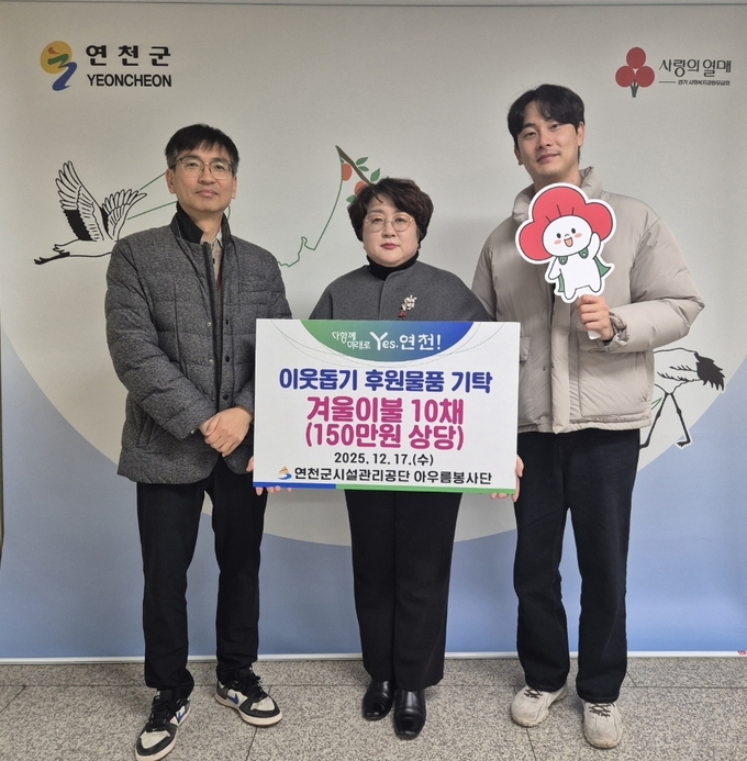 연천군시설관리공단 아우름봉사단은 지난 17일 연천군청을 방문해 연말연시 관내 취약계층 지원을 위한 150만 원 상당의 겨울이불 10채를 기탁했다.