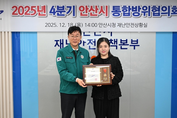 신진화 고려대안산병원 응급의학과 책임간호사가 지난 18일 안산시청 재난안전상황실에서 열린 ‘2025년 4분기 안산시 통합방위협의회’에서 을지연습 유공으로 안산시장 표창을 받았다.