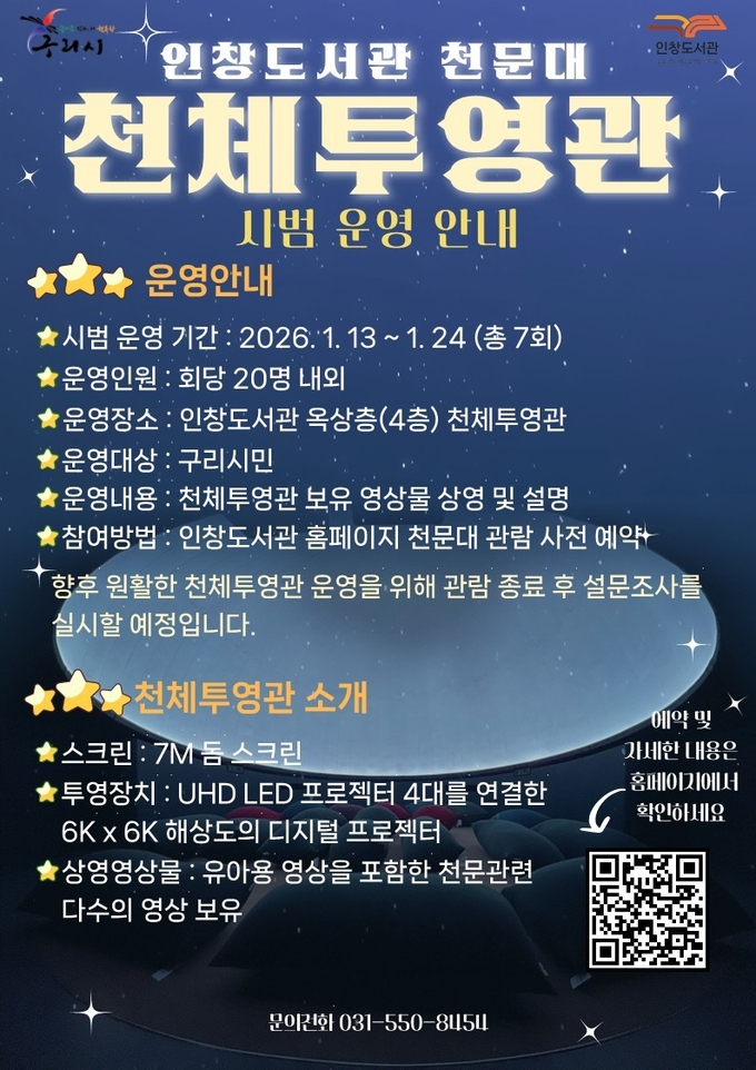 구리시는 오는 13일부터 24일까지 인창도서관 옥상에 설치된 천체투영관의 시범운영을 실시한다고 12일 밝혔다.