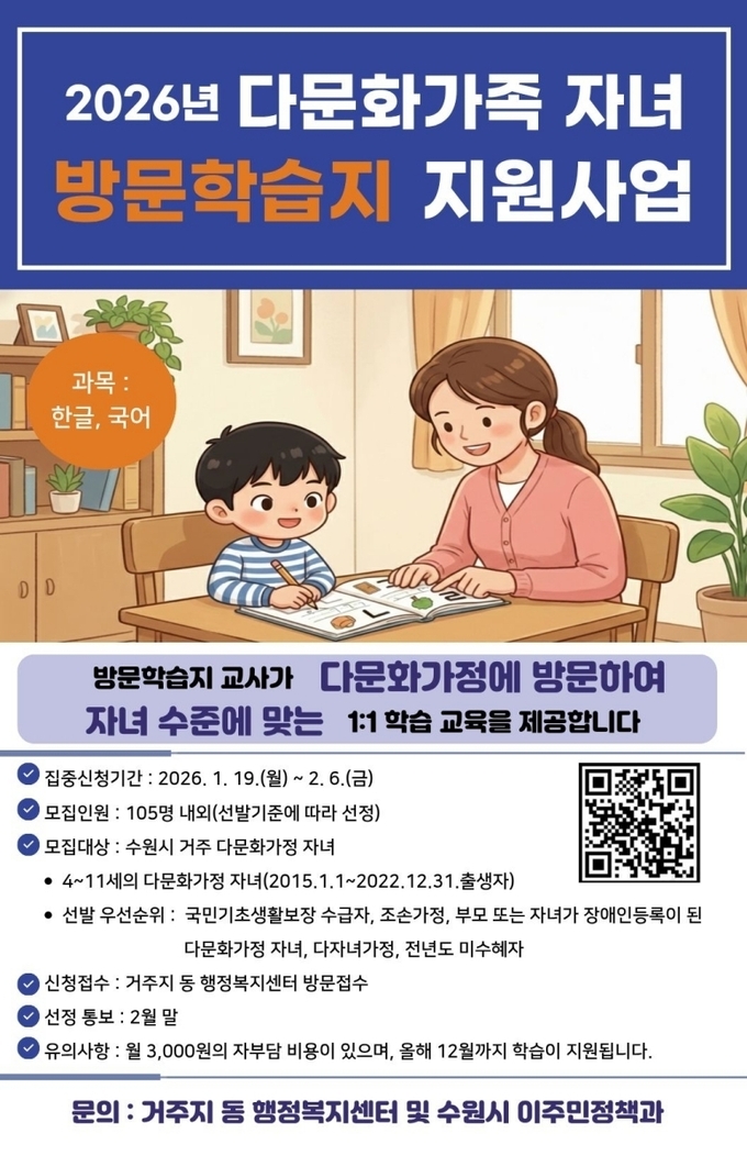 사업과 관련한 자세한 사항은 수원시 홈페이지 게시판에서 ‘2026년 다문화가족 자녀 방문학습지 지원 사업 대상자 모집’을 검색하면 확인할 수 있다.