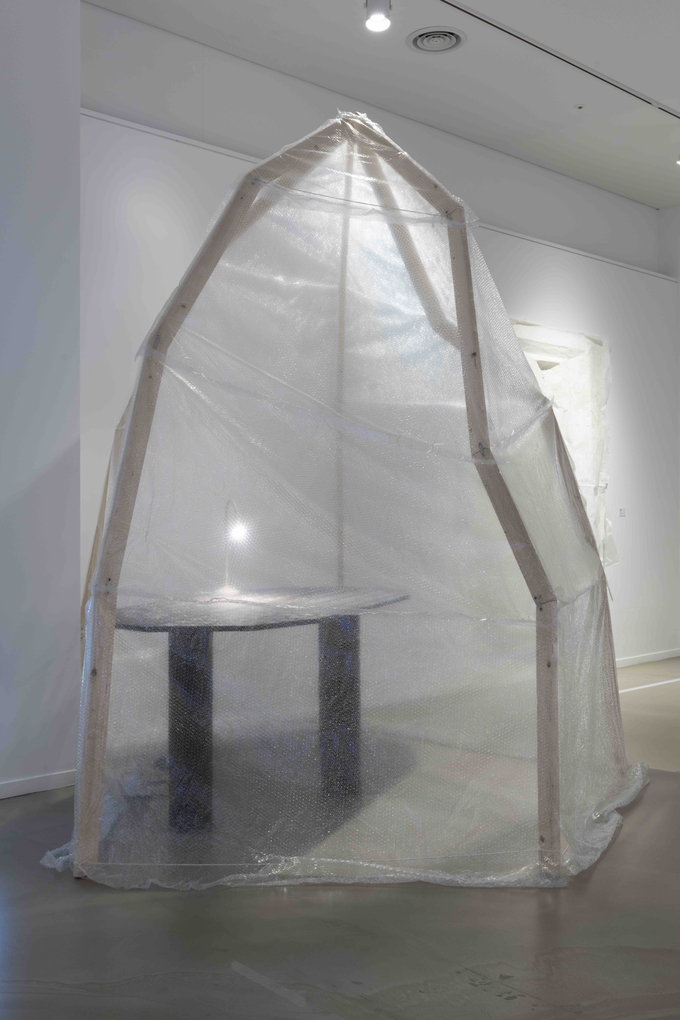 대표 작품으로 ‘1.2인의 요새’를 언급한 김 작가는 “이 구조물은 지난해 6월 의정부예술의전당에서 열린 개인전에 선보인 작품인데 급변하는 현대사회의 극심한 경쟁 환경과 국제적 갈등 등 거대 문제에 대응하는 개인적 도피처”라며 “재료는 목재와 뽁뽁이로 매우 취약하고 내부도 쉽게 볼 수 있는 구조인데 구조물 안 책상에는 이상기온 및 폭압적 날들의 흔적이 새겨져 있다”고 설명했다.