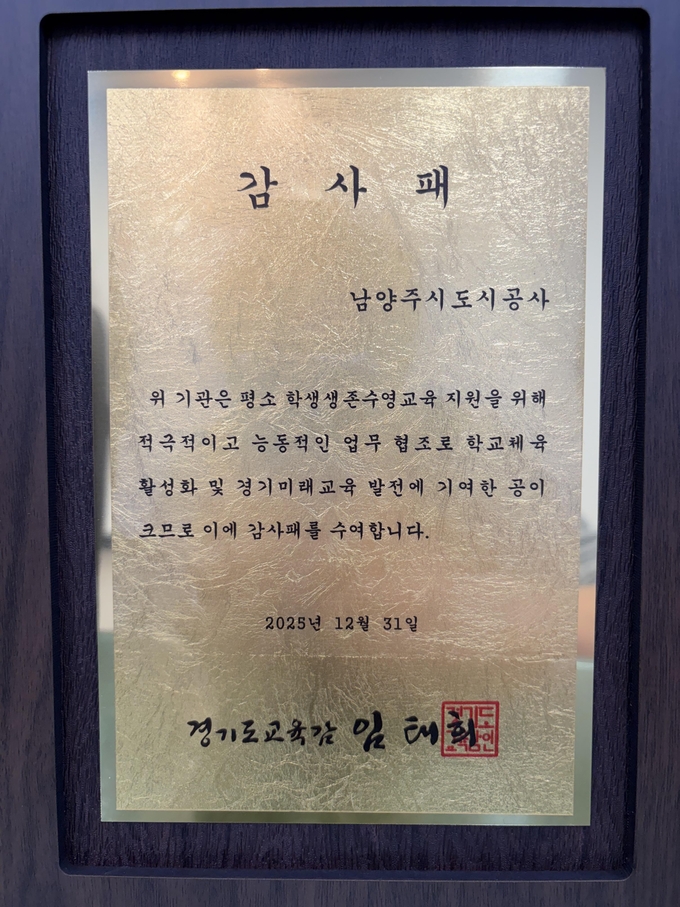 남양주도시공사(이하 공사)는 남양주시 및 경기도구리남양주교육지원청과 전국 최초로 업무협약을 체결하고 시행한 ‘초등학생 생존수영 교육’의 성공적 운영 공로를 인정받아 경기도교육청으로부터 감사패를 받았다고 3일 밝혔다.