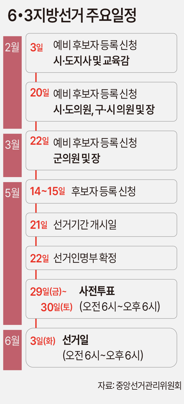이어 오는 20일부터 도의원, 시장, 시의원의 예비 후보자 등록이 가능하고, 군 단위 지역 의원과 군수 선거의 예비후보자 등록은 다음 달 22일부터 시작된다.