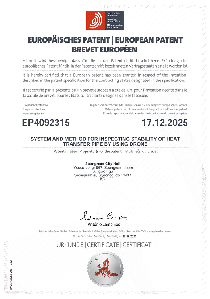 성남시는 시가 자체 개발한 ‘드론을 이용한 열수송관 안정성 검사 시스템’이 유럽특허(등록번호 EP4092315) 등록을 완료했다고 밝혔다. 시가 보유한 기술이 해외에서 특허로 인정받은 것은 이번이 처음으로, 지식재산의 해외 권리화를 통해 유럽 시장 진출을 본격화하는 계기가 될 것으로 기대된다.