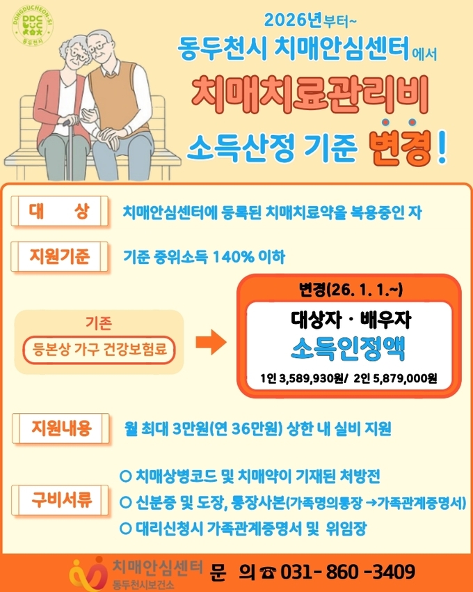동두천시 치매안심센터는 올해 1월 1일부터 치매치료관리비 지원사업 소득 산정 기준이 변경됐다고 4일 밝혔다.