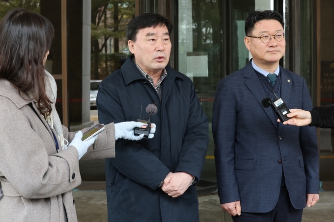 이날 서울 서초구 대법원에서 박강배 5·18기념재단 상임이사(가운데)와 김정호 변호사가 입장을 밝히고 있다.
