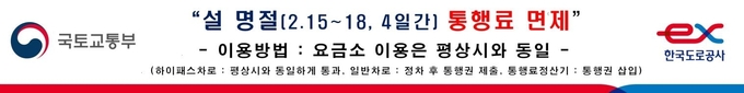 고객서비스 분야에서는 15일 0시부터 18일 자정까지 통행료를 면제하고, 휴게시설 화장실 88칸을 추가 확충한다. 휴게소 서비스 인력도 평시 대비 하루 290명 증원한다.