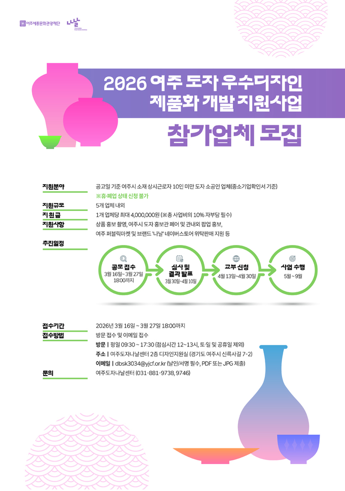 한편, 신청 접수는 오는 3월 16일부터 3월 27일 18시까지 진행된다. 참여를 희망하는 업체는 재단 홈페이지에서 서식을 내려받아 작성한 후, 여주도자나날센터 방문 또는 이메일로 제출하면 된다.