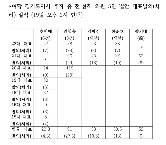 여당 경기도지사 주자 6인 중 김동연 경기도지사를 제외하고 전·현직 국회의원 5인의 법률안(이하 법안) 대표발의 수와 처리실적을 확인한 결과 크게 차이를 보이는 것으로 나타났다.