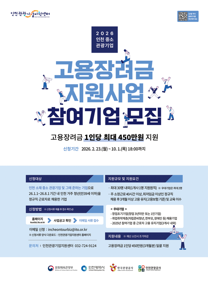 사업 신청은 오는 23일부터 10월 1일까지 진행하며, 에산 소진 시 조기 마감될 수 있다. 참여를 희망하는 기업은 인천관광기업지원센터 누리집(tourbiz.ito.or.kr)에서 신청 서류를 확인 후 이메일로 제출하면 된다.