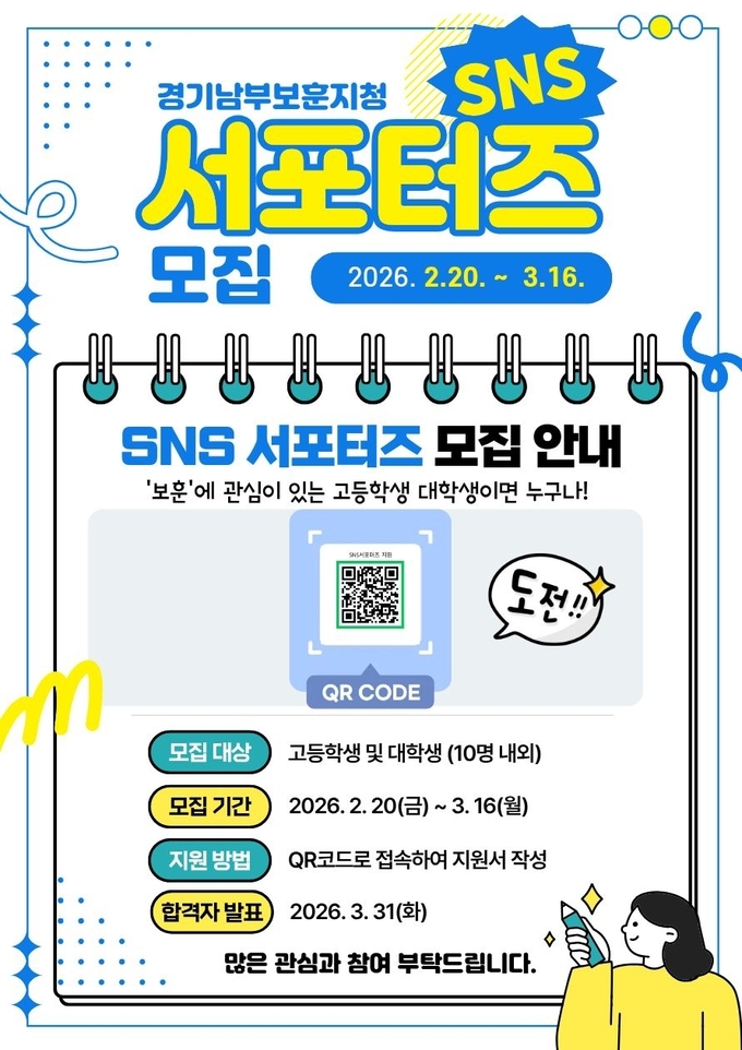 국가보훈부 경기남부보훈지청(지청장 이향숙)은 20일 다음 달 16일까지 온라인 공간에서 보훈문화를 알리는 ‘SNS 서포터즈’를 모집한다고 밝혔다.