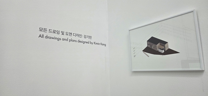 벽면 한쪽에는 '모든 드로잉 및 도면 디자인: 강기민'이라는 문구가 함께 적혀있어 작가가 동생에게 바치는 전시임을 명확하게 표현한다.