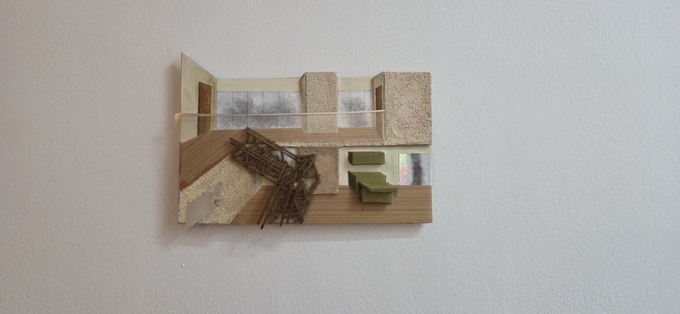 이러한 액자들을 지나 안쪽에 마련된 공간으로 들어서면 나뭇가지와 시멘트 등 다양한 재료로 표현한 거실이 등장한다.