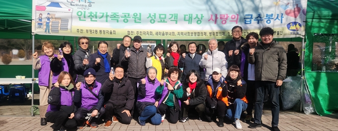 이들은 추운 날씨에도 인천가족공원을 찾는 성묘객들에게 하늘수를 제공하며 따뜻한 정을 나눴다.