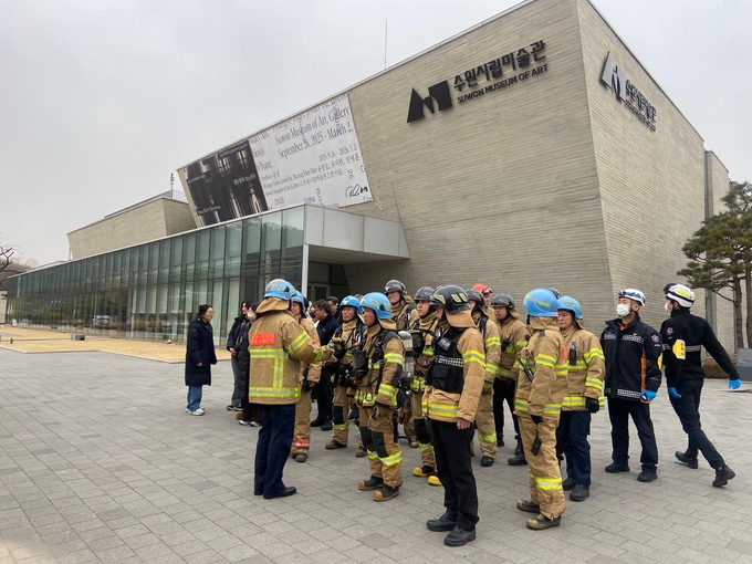 수원시립미술관이 24일 화재 시 미술관과 작품을 보호하고 관람객 및 직원 피해 최소화를 위한 특별 소방 합동 훈련을 성료했다.