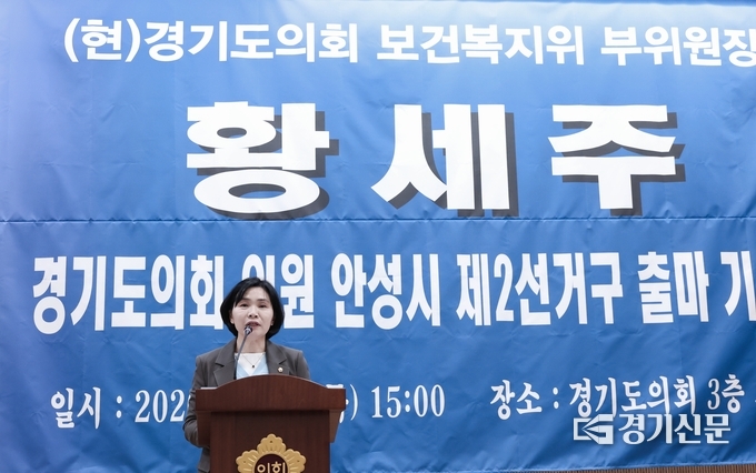 황세주(민주·비례) 경기도의회 의원이 제9회 전국동시지방선거 안성시 제2선거구 경기도의원 선거 출마를 지난 26일 경기도의회 브리핑룸에서 기자회견을 열고 공식 선언했다. 안성시 제2선거구는 보개면·금광면·서운면·일죽면·죽산면·삼죽면·안성1동·안성2동을 포함한다.