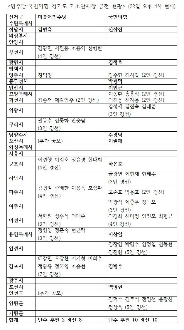 22일 여야에 따르면 민주당은 이날 오후 4시 현재 경기도 31곳 중 단수 추천 2곳, 경선 8곳 등 총 10곳을 결정했고, 국민의힘은 단수 추천 10곳, 경선 10곳 등 총 20곳을 결정한 것으로 나타났다.